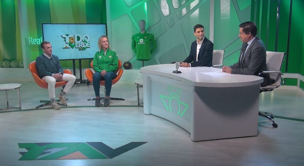 La remera Estela Díaz y el capitán y timonel verdiblanco Tomás Jurado, protagonistas en la televisión oficial del Real Betis en la previa del derbi del Guadalquivir, que se disputa este sábado.