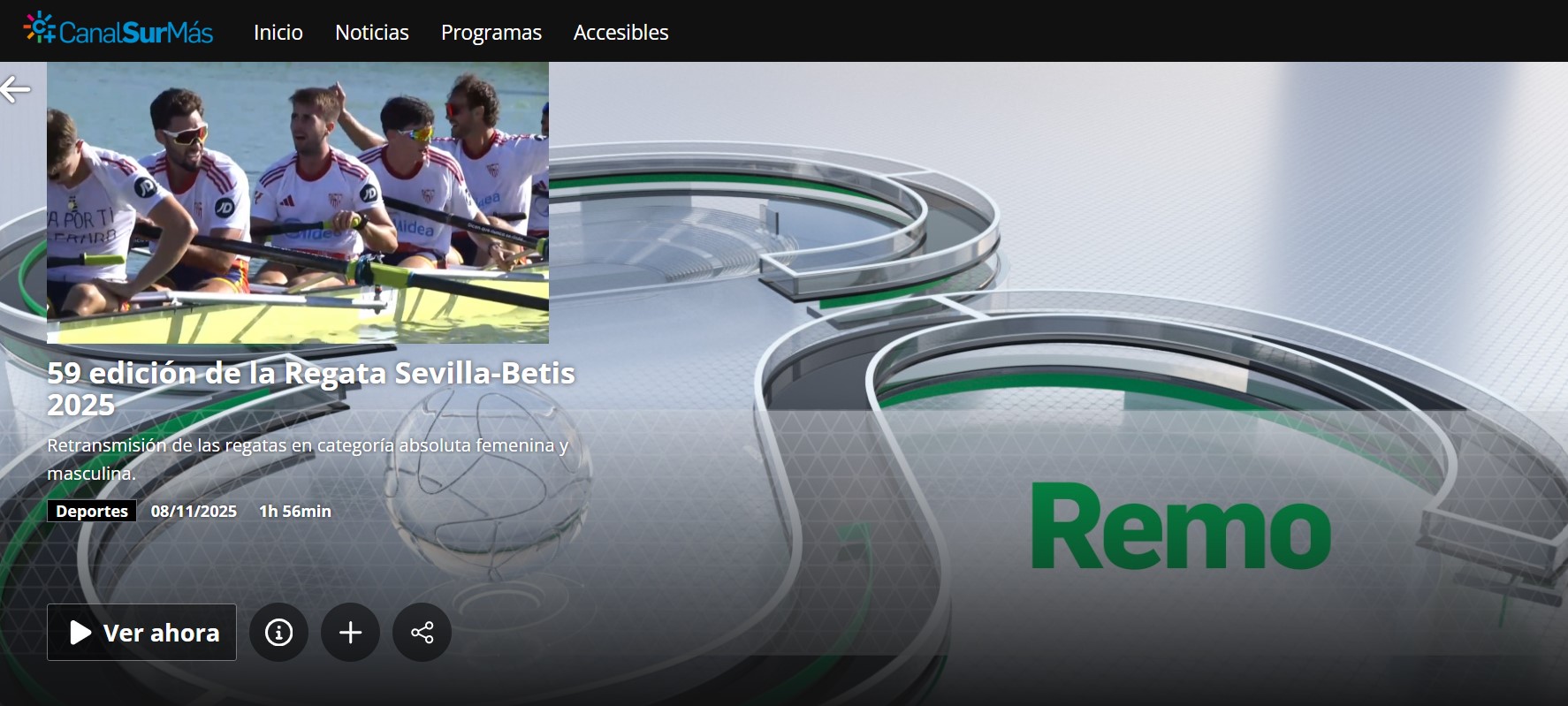 Retransmisión en Andalucía TV y CanalSurMás de las regatas femenina y masculina absolutas, con la narración de Eugenio Cosgaya y comentarios de los exremeros Elena Fernández y Luis Moreno. https://www.canalsurmas.es/videos/detail/293351-remoregata-sevilla-betis