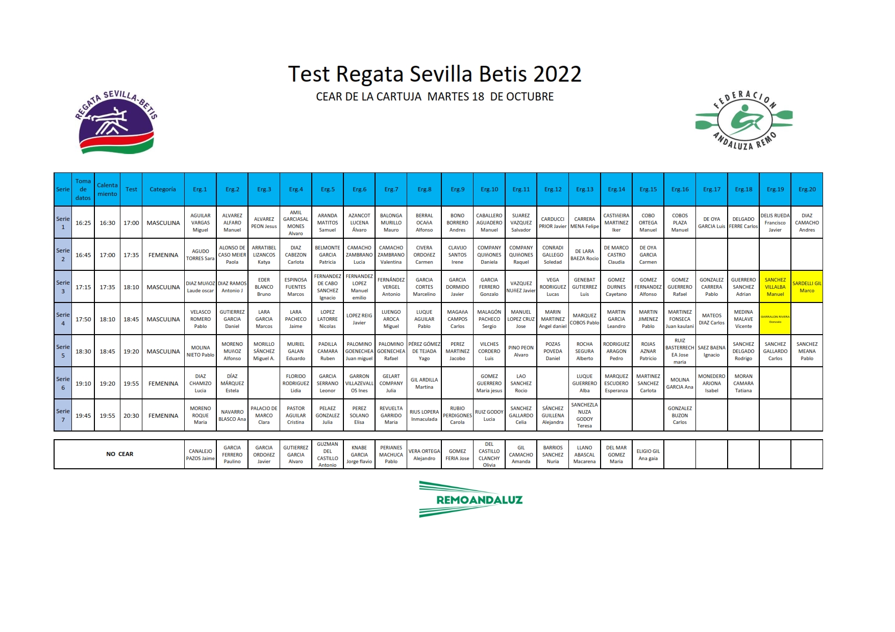 Horarios de los test de la categoría absoluta, programados este martes, 18 de octubre, en el Centro Especializado de Alto Rendimiento de La Cartuja.