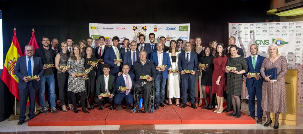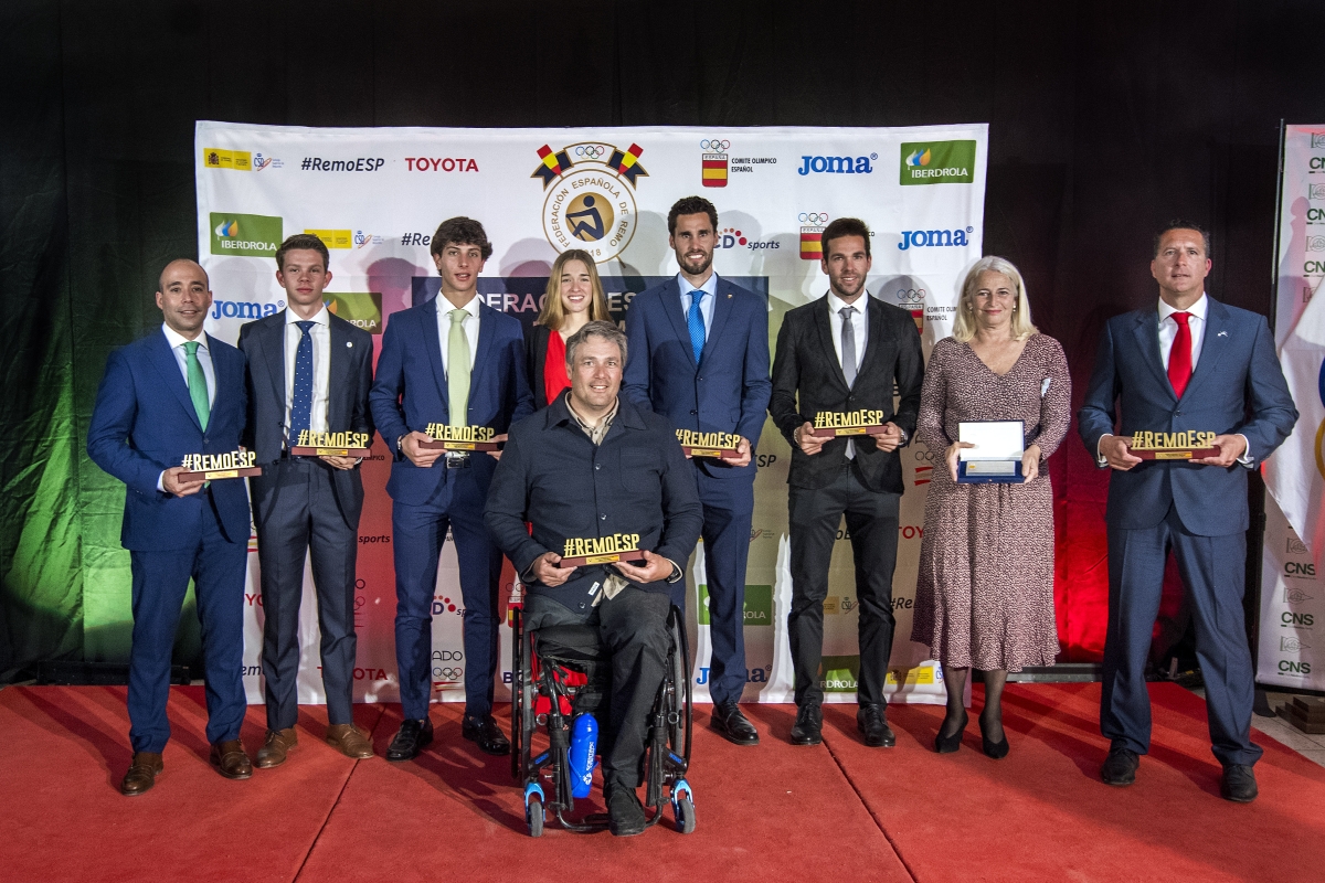 Los remeros del Sevilla F.C. Jaime Canalejo, Jorge Flavio Knabe, Pablo Moreno y Juan Miguel Palomino y el remero de Real Betis Javuer García, entre los premiados en un acto celebrado en el Club Náutico Sevilla.